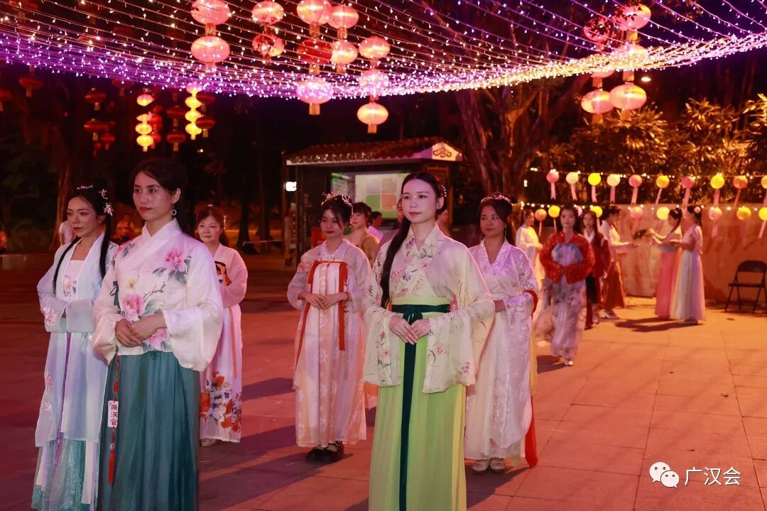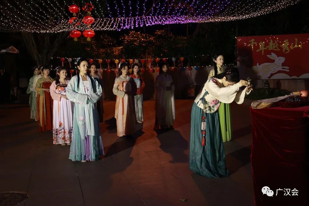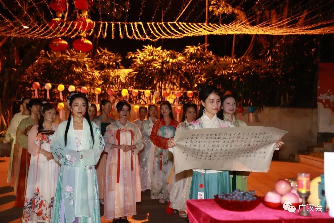 19日活动预热时,央视还过来拍摄,并于20日晚间的新闻联播,报道广汉会和市民一起过中秋情况。 21日活动当天,广州广播电视台还直播整个拜月的过程。 点击阅读原文,即可观看回放(视频第25分钟开始就是这次的活动) 19日在拜月过程中不断地听到市民说中秋就该这样;拍摄结束后,其中几位街坊还特意跑过来,说要学习如何拜礼、敬酒、上香,很认真的学起来准备中秋当日在家进行;有位妈妈带着两个上小学的孩子,得知中秋有正式的活动时,立刻说到时我们也穿上汉服来…… 在放河灯时,好几位阿婆站旁边,当我们把河灯投进湖水中时,阿婆用广州话说:“大家身体健康,平平安安,赚多点钱,女儿早日揾到如意郎君。” 广汉会的活动一直都十分注重“将汉服融入生活,用礼仪带动群众”。在传统节日中,我们会组织汉服同袍去慰问弱势群体,在节日民俗活动中,我们不是单纯展示或只是让市民体验,而是与民同乐,让市民一起参与进来,因为我们的节日属于我们所有人。我们就是这样一支接地气的宣传传统文化的志愿队伍,“志愿者”才是我们主要的共同身份。 感谢大家都很给力参与,中秋当晚有点小雨,大家都担心雨会影响活动,有市民说水为财水为财,代表中秋后大家就开始赚大钱啦,后来活动开始,雨也停了。感谢众伙伴的支持和付出! 主持、赞者:唐糖 主祭、亚献、终献:上官圈圈、洛离、雪溪、安安 执事:洛儿、钰瑤、宛之 从祭:琉璃、桃花岛主、芳芳、心媛、映彤、苏令、子歌、花泽香菜、羽桐、言柒、金音符天使、云曦、兔桂花、Dissa、张家妹妹、轻舞飞扬、LIANG、阿乔、娴雅妞、陈默、映彤、上卿沫、清明、有一种借口叫年轻、落轩、顿慧、漫漫、清影、猫神、小小、京墨、默默、芳芳、芸苔、琉璃、逸仙、liuyue、墨寻、诸葛鱼、青柠香、Miao、Vivi、焕焕、飒、健康·美、一寻千梦 工作人员:一江水、燕十四、渭水有雀、钟幼明、沙师弟、云曦 摄影摄像:谭老师、静云、安杰、淑琴 后勤:俊雯、小牛 祝文文案:凖飞 祝文书写:张国桃、上官圈圈 感谢越秀公园的大力支持,给街坊市民一个传统的中秋节!