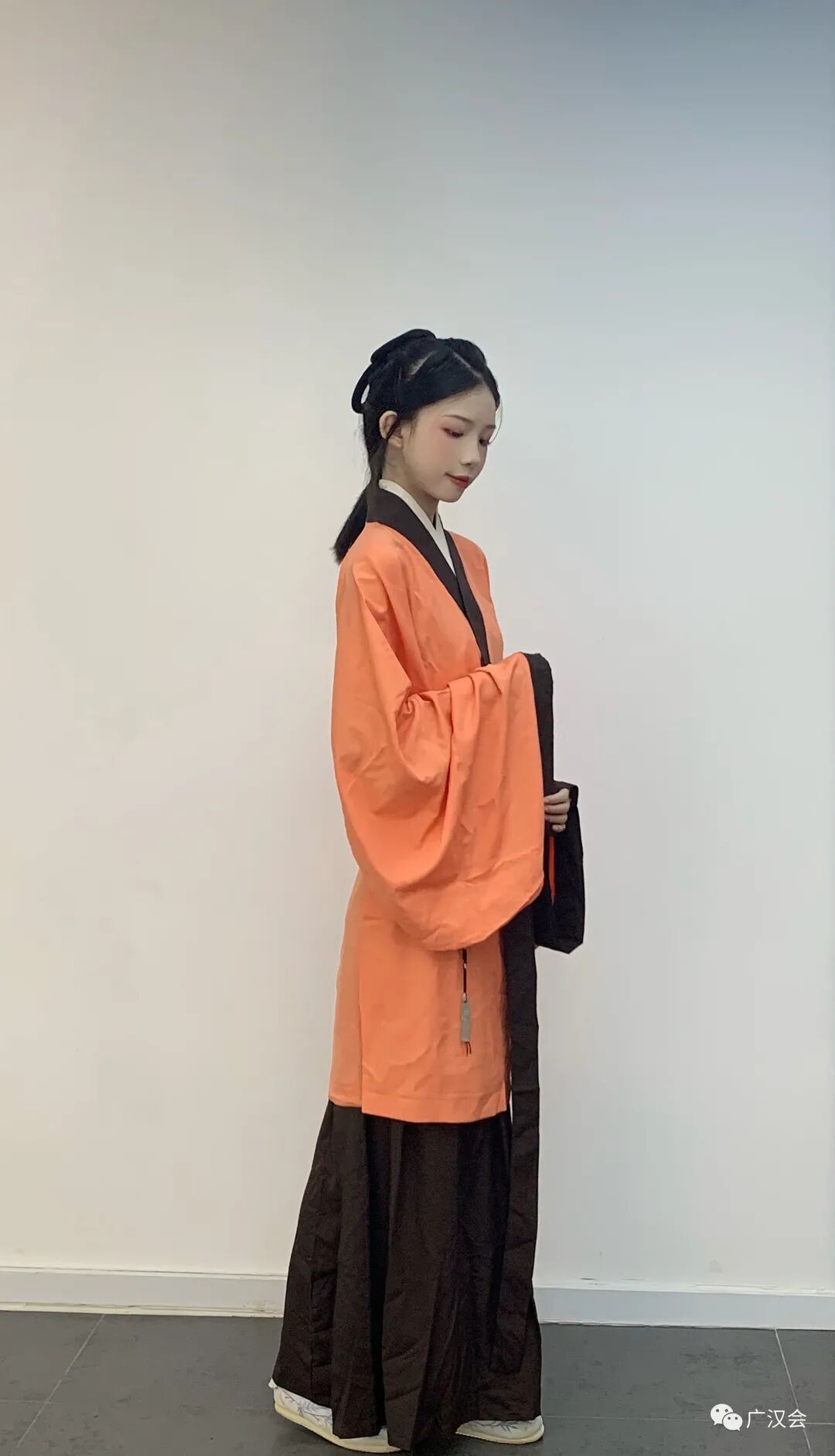 本次成人礼服饰采用南越时期的主流汉服款式——深衣。衣服颜色类同广州的市花——红棉,女生着橙红色,为花,男生是绿色,为叶,衣缘的深咖色寓意着红棉树干,是极具岭南特色的汉服礼服。
