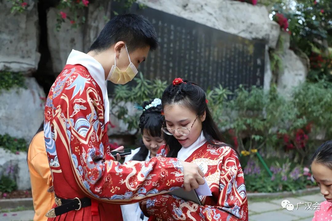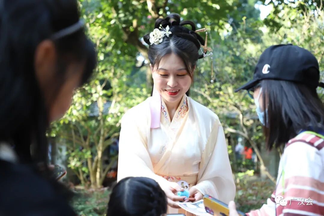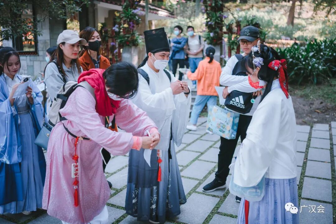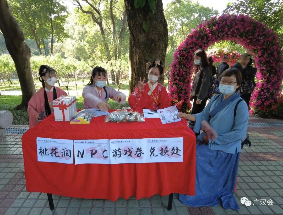 “羊城隽秀·云山时光”,2021广州市簕杜鹃花展百花来袭。受白云山明珠楼景区之邀,广汉会再次助力花展,为市民游客准备的汉文化专场和汉服NPC互动游戏。 11月26日花展的媒体日,簕杜鹃花仙在美美的簕杜鹃花丛中翩然而过。 媒体报道:太美了!超40种簕杜鹃花,5万盆时花,真正的花海等你来打卡! 11月27日,是汉服专场活动。来来来,认识一下花仙花神,玩NPC游戏时,才能又快又准地找到他们,完成任务呢。 舞动山水之间,寄情华夏千年。近期大家有没有被“舞千年”里美轮美奂的古典舞震撼到呢?这天来到白云山明珠楼的同袍,可一饱眼福,欣赏到古典舞、中国功夫、民乐演奏等汉服才艺表演。 《相和歌》鼓舞 ——高阁儿 《精忠报国》双节棍 ——赵春 《天下》竹笛 ——赵春 《无情画》歌舞—— 江瑟瑟(歌)、尔儿(舞) 《临安初雨》古筝伴舞—— 林俞汎(古筝)、青葙儿(舞) 《伏羲神天响》武术 ——无极元君、泠菲浔 《春水摇》独舞 ——晓夏 《湖光水色调》歌舞—— 友菱(歌) 、 江瑟瑟(舞) 一般男子行揖礼,女子行肃礼。推手为揖,引手为肃。行礼时,一人先行,然后受礼者答礼。 揖礼:左手在外,右手在内,双手胸口处向外平推,同时鞠躬四十五度,然后起身,手放下。 肃礼:右手压左手,双手交叠在腹部中间,微微屈膝,同时微点头。 学完汉礼,立刻可以在NPC游戏里派上用场 看完表演,汉服同袍们带领着一众街坊来到桃花涧玩起NPC游戏,重温唐诗宋词,通关者只要完成唱、跳、朗诵等任务即可获得集章兑换礼物。一边寻找花仙花神,一边将簕杜鹃花展的美景收入眼中。 游戏设计得特别有趣,吸引了几百位街坊和同袍参与,很多参与者还问第二天还有这个游戏不?广汉会的活动一向实用、有趣、超值呐,记得将我们公众号标星,第一时间接收最新的活动消息哟。 和“林深见鹿”合影就能完成任务咯 通关者需背诵一首包含“花”的诗词 通关者需唱一首包含“花”的歌曲 跳个健康操 再说个笑话逗笑花神就完成任务啦 有参与者反应花神很难找到,既然是花神当然在云中深处啦,认真看攻略的地图提示,还是很多同袍和小朋友完成7个章的打卡呢。 集齐7个章,召唤白云飞索票一张!特别提醒,获得了飞索票的同袍,要注意票面写的使用时间,不要错过哟。 获得蕴诗本草的明星产品体验包的同袍,如果觉得好用,可以到他家微店购买哟!广汉会会员购买护肤化妆品等还能有九折优惠。 白云山文创雪糕,造型漂亮且好吃,草莓味是小编的最爱。 活动策划:青葙儿、上官圈圈 主持:紫堇 表演:高阁儿、赵春、江瑟瑟、尔儿、林俞汎、青葙儿、无极元君、泠菲浔、晓夏、友菱 幕后:栗子、小牛 花仙花神:唐夏、璇卿、含露、南枝、渭水、映彤、青葙儿、诗思 通关卡发放:晗瞳 礼物兑换:梦江南、俊雯 幕后:小新、羽墨 李弘一、朱富元、墨寒、静静的云彩还有参与活动的同袍也相互拍美照上传到活动群,用镜头助力簕杜鹃花展。 集市对接:一江水 欢迎大家在评论区里留言活动参与感想。 再次感谢白云山明珠楼景区、白云飞索、蕴诗本草为本次活动提供丰富的奖品! 花展期间白云飞索推出了优惠票 (注:宣传图上白云飞索的票价,不是白云山门票票价哟~)通关者在“连理亭”比心合影完成任务中