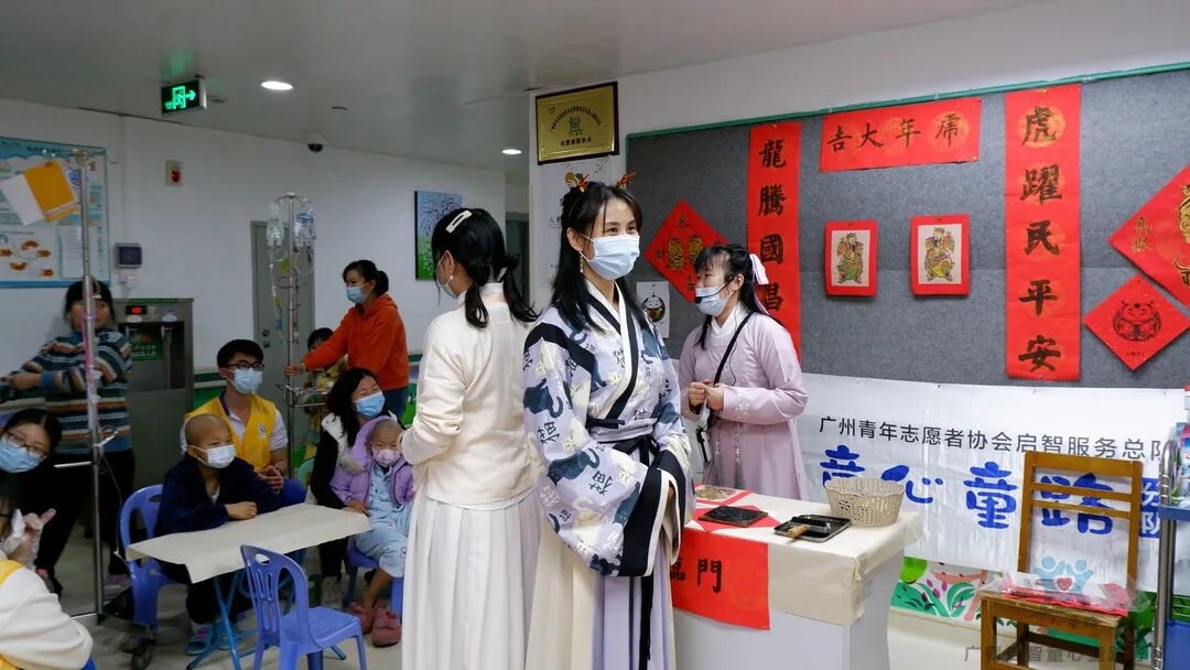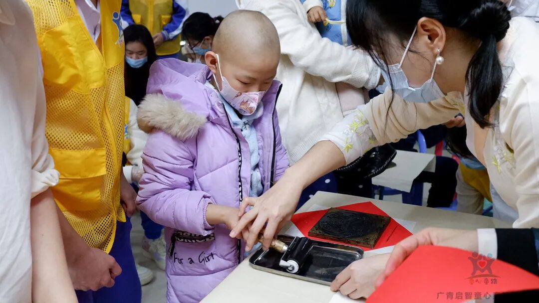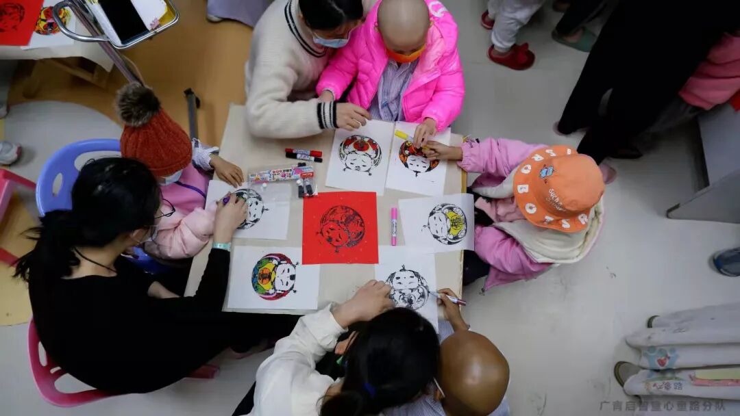 春节临近,人们纷纷开始一场团圆与爱的旅途,然而还有一大群孩子因为疾病还得留在医院治疗。 1月21日,肿瘤医院儿童肿瘤科年味十足,皆因广汉会的俊雯老师,给大家带来了“国家级非遗佛山木版年画”课堂。在布置病房大厅时,有两位正在输液小男孩儿,看到上官姐姐站在椅子上,一位帮忙扶住椅子,一位帮忙贴春联,非常的贴心。离活动还有二十分钟,大厅就坐满了人,都期待着俊雯老师的讲解。小朋友们十分很喜欢,自己动手印刷年画娃娃,连志愿者和护士姐姐都忍不住一起来。 俊雯老师在讲解年画由来 上官姐姐和心蓝姐姐在演绎贴错门神