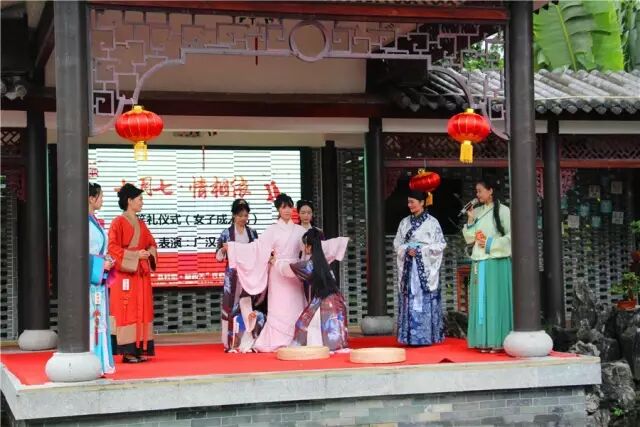 女子乞巧“拜七姐”,七夕节最早的内涵主要是乞巧,表彰女子巧慧,女人们在这一天展示刺绣、针线等手艺绝活。广汉会的姑娘们穿着美丽的汉服,左手持香扇右手持香,鞠躬焚香“拜七姐”。整个拜七姐仪式通过“净手”、“上香”、“颂文”、“礼拜”、“斗巧”等流程来展示女子向织女(七姐)祈求幸福美满的愿望。